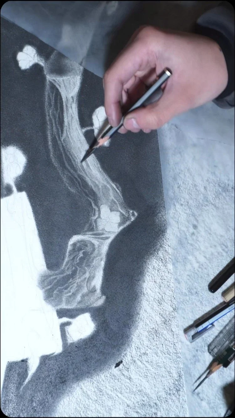 Je m’appelle Mathéo Loridan, je suis un artiste dessinateur de 24 ans, j’habite en Belgique. Je pratique le dessin depuis mes 19 ans. Je dessine depuis 4 ans dans un garage souterrain que je paye à l’aide d’un travail alimentaire. J’expose mon travail depuis bientôt 2 ans entre Mouscron, Tournai et Courtrai. J’utilise exclusivement le crayon, crayon charbon et de la poudre de graphite que je manipule à ma guise pour réaliser au mieux mes œuvres. Je fonctionne aux émotions ; Je ressens, je cherche le déclencheur, je l’illustre dans ma tête à l’aide de ce que j’appelle des « Flash » qui m’apparaissent de temps à autre pendant la journée. Je réalise ensuite des collages laborieux sur mon iPad avant de poser le tout sur papier. Mes inspirations sont tirées de l’hyperréalisme, le surréalisme et de temps à autre l’impressionnisme. J’essaye au mieux de mélanger ces styles afin de créer des œuvres uniques à l’image de mes émotions.